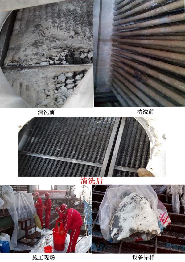 復(fù)合型蒸發(fā)式冷卻器上部是風(fēng)冷式,下部為水冷式。因此上部翅片管束表面由于接觸環(huán)境大氣、易于積存油膩、塵垢、煙垢、柳絮等附著物,形成較大的熱阻,污垢的存在將大大降低甚至喪失鋁翅片冷換設(shè)備的冷卻作用。另外鋁翅片表面的污垢也會(huì)促使垢下腐蝕。下部水冷式光管表面由于外部環(huán)境條件影響,并且由蒸發(fā)式空冷器的特點(diǎn),造成循環(huán)冷卻水濃縮快,濃縮倍率高,硬度,堿度高,濁度高等困難。在長期運(yùn)行過程中,空冷器光管束表面生成了很厚的硬垢,嚴(yán)重影響了空冷器換熱效果,增加了能耗,影響了正常生產(chǎn)和安全。為了保證設(shè)備安全,穩(wěn)定運(yùn)行,延長使用壽命,提高冷卻效率,應(yīng)對其進(jìn)行定期清洗。